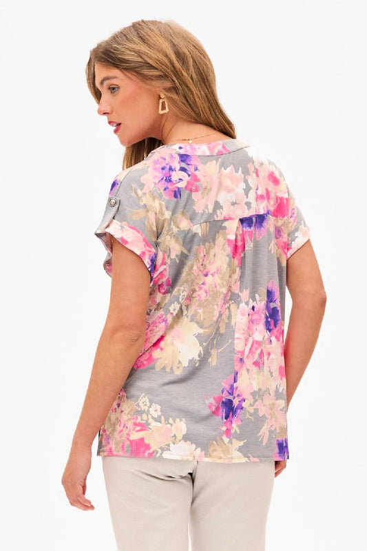 ON SALE - Dear Scarlett - Dolman Short Sleeve Top - Grey/Pink Multi Floral Top