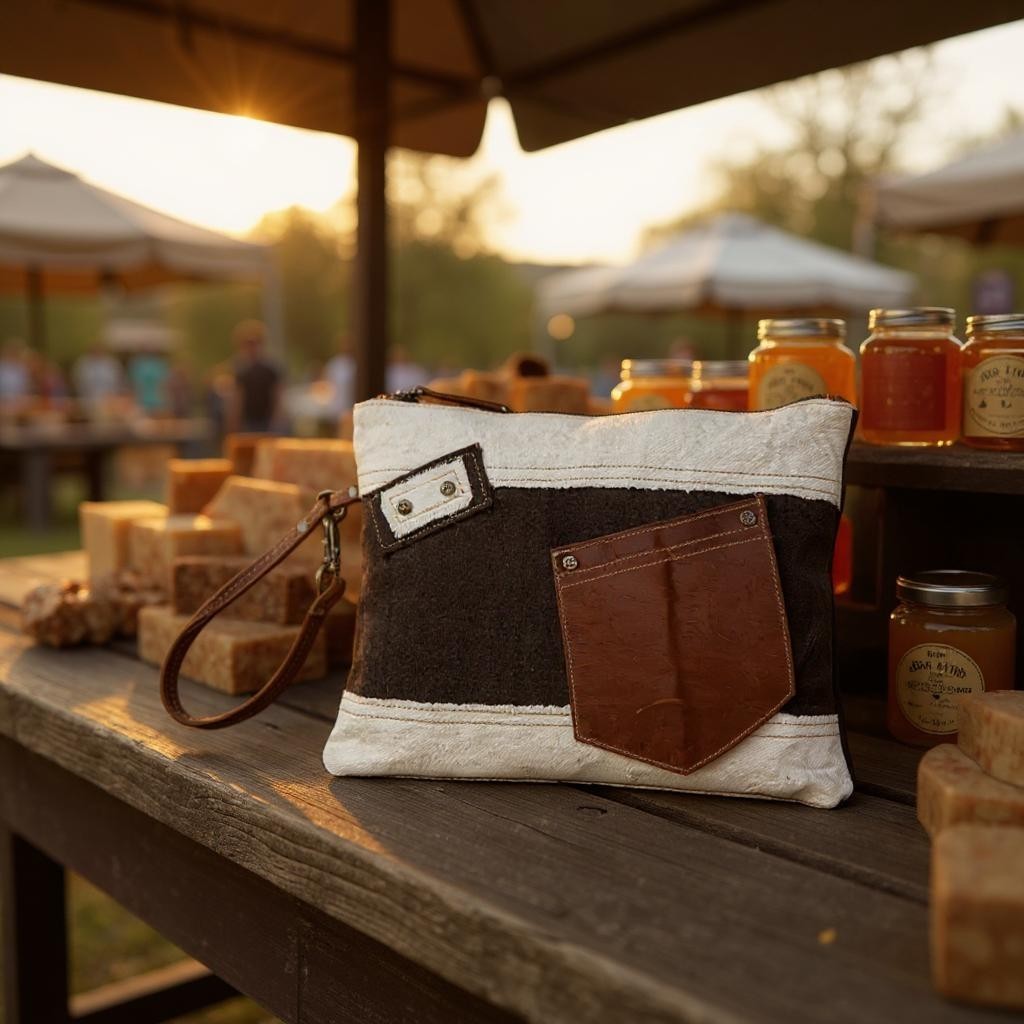This charming clutch bag is perfect when you’re on the go. It features gorgeous duo-tone canvas in white and rich chocolate brown with special accents, including a charming pocket. The back is brown woven canvas. Zipper-close top and durable leather wristlet strap.