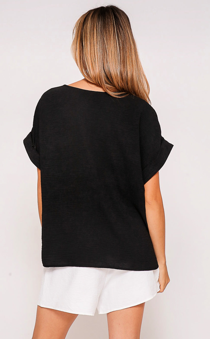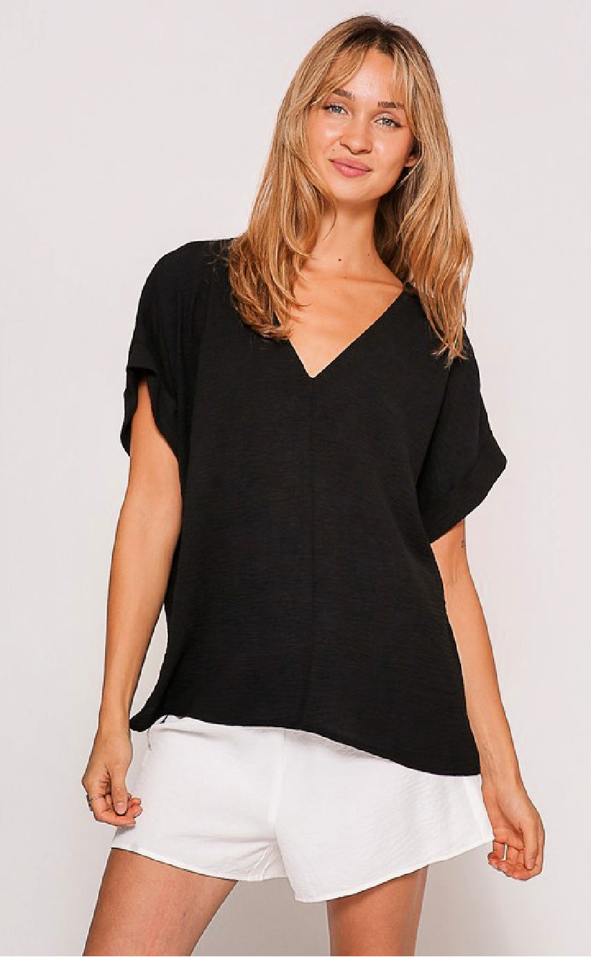 This breezy top features a v-neck, cuffed sleeves, and a lightweight, breathable fabric - ideal for sunny days! Mix and match with skirts, shorts, or anything else in your wardrobe!